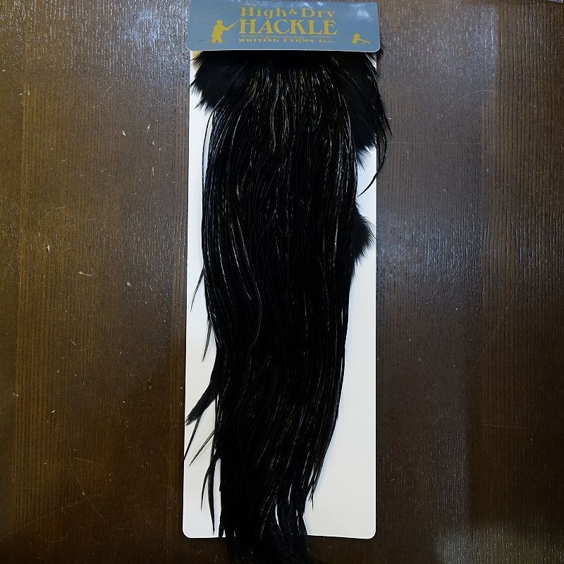 このサドルもケイプ同様に、ホワイティング・ルースター・サドルと比較するとハックル・ファイバーが長めで、たとえばパラシュート・パターンにつかうならばフックサイズ14番前後から最大でフック・サイズ10番前後のハックルが生えています。