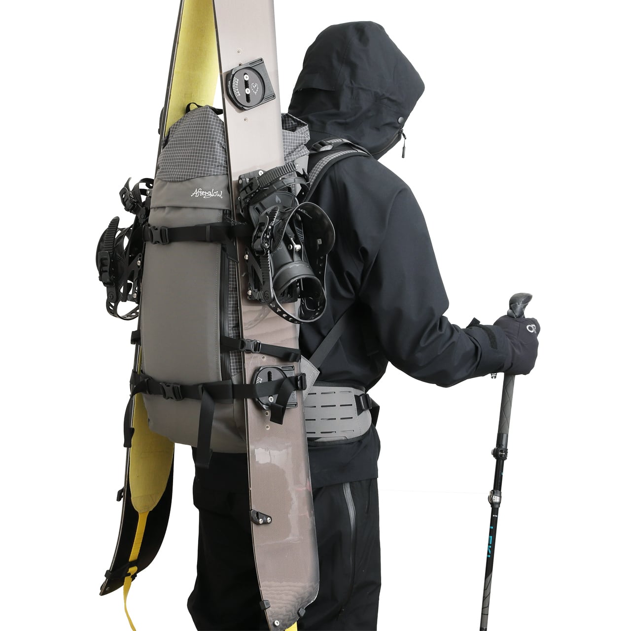 ハイクアップの時は、荷物の重量を腰で背負えるようにサポートし、滑走時には同じように腰で荷重を支えつつもターンやトリック時の動きに対して追随する為、驚くほどの動きやすさを実現しました。