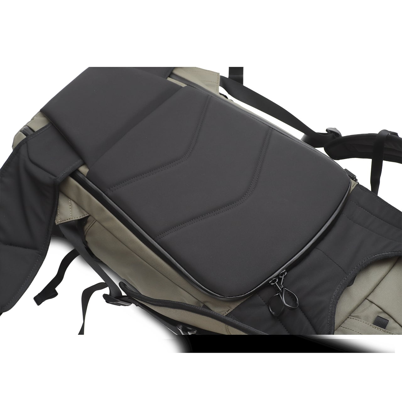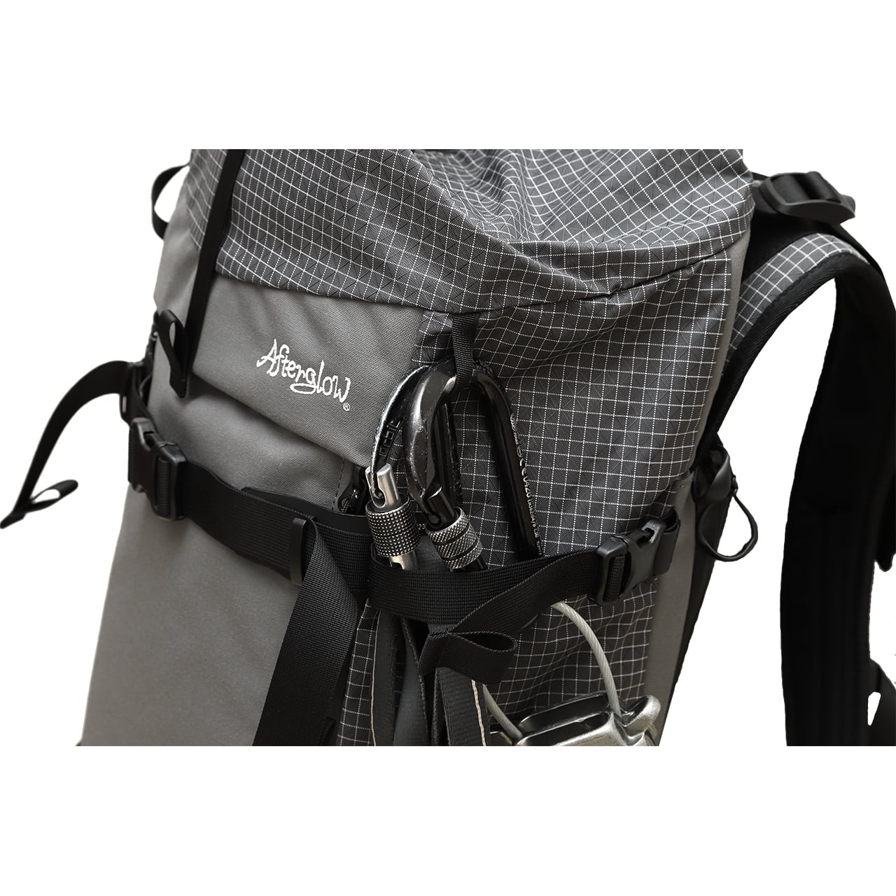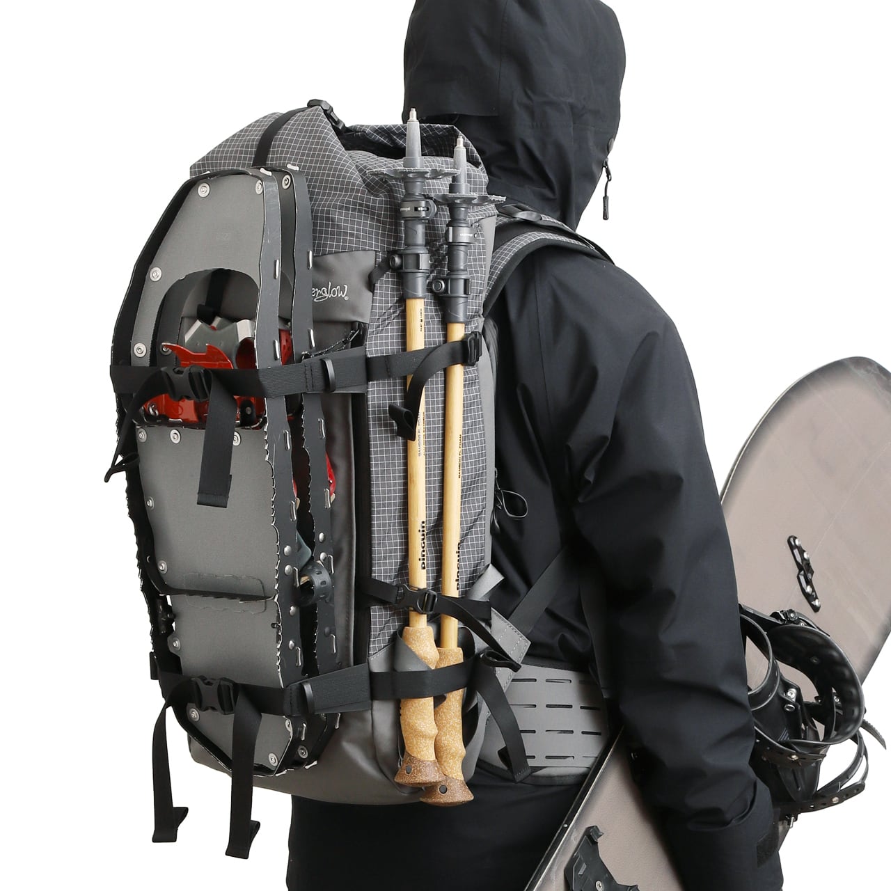 表面の上下二本ボードストラップは、板を背負ったりスノーシューを背負う際にブレが少なく重さを効果的にショルダーストラップに分散するためストレスの少ないハイクアップや滑走を実現しています。