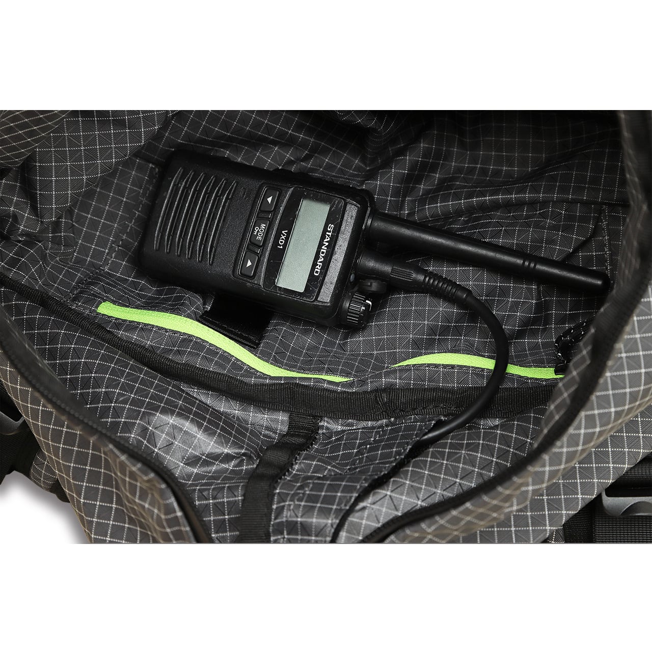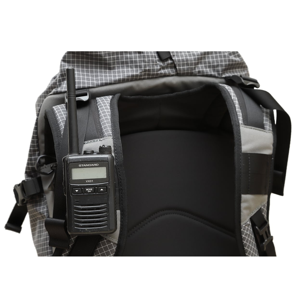 スピーカーマイクを使用する場合は、この部分に無線機を取り付けて上部ポケットにある斜めに開くベルクロ開閉式のトンネルから、無線機に接続されたままのスピーカーマイクを通すことができます。(周囲18cmまでの大きさのスピーカーマイクや無線機が通ります)
