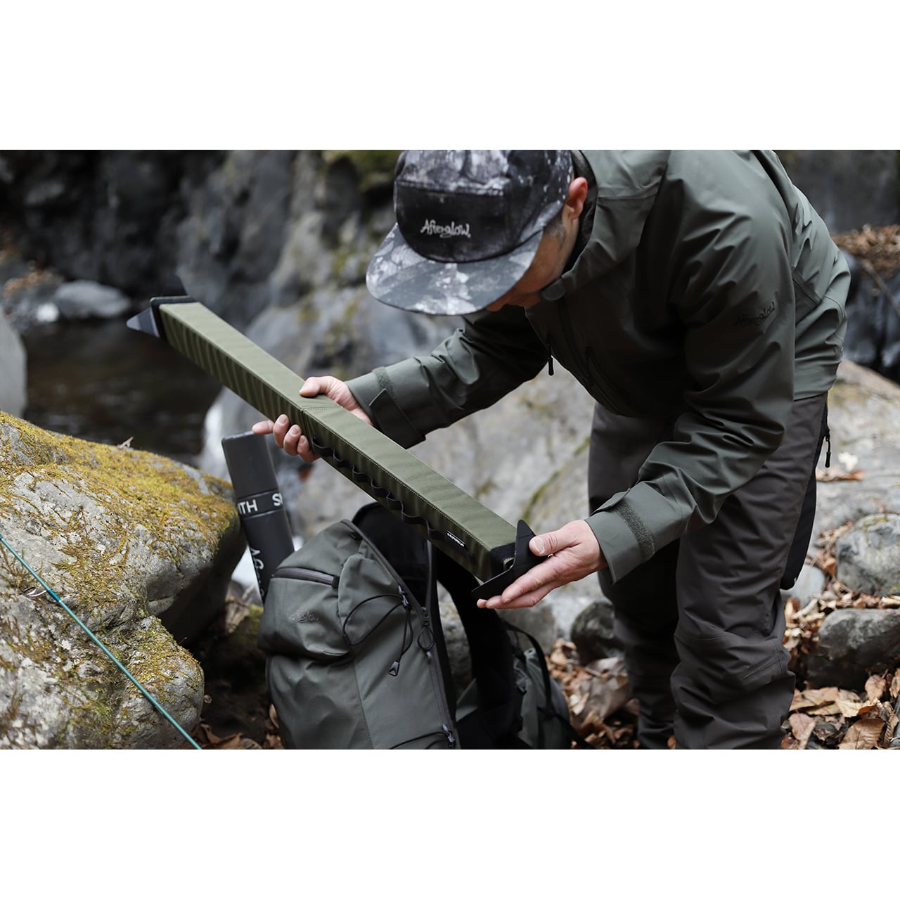 入渓点までのアクセス時は、筒の状態でバックパックに取り付けて行き、釣行時には、折りたたんで、STREAM CHASER BACKPACKの中に収納できるサイズで設計してありますので、ロッドケースが木に引っ掛かったりする煩わしさから解放されるでしょう。