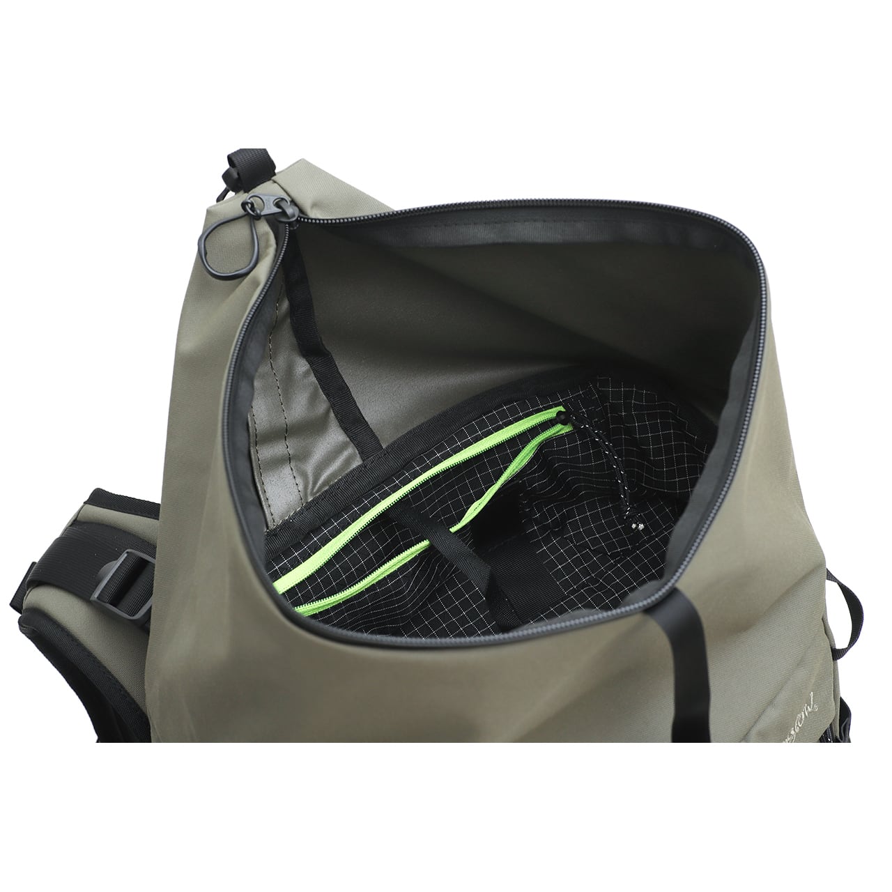 YKKアクアガード(止水ファスナー)を使用し背面がU字にフルオープンする仕組みでパキングがしやすく、ツアー中に雪面へバックパックを下ろした際、板などが装着されていても内容物が出し入れがしやすい構造です。
