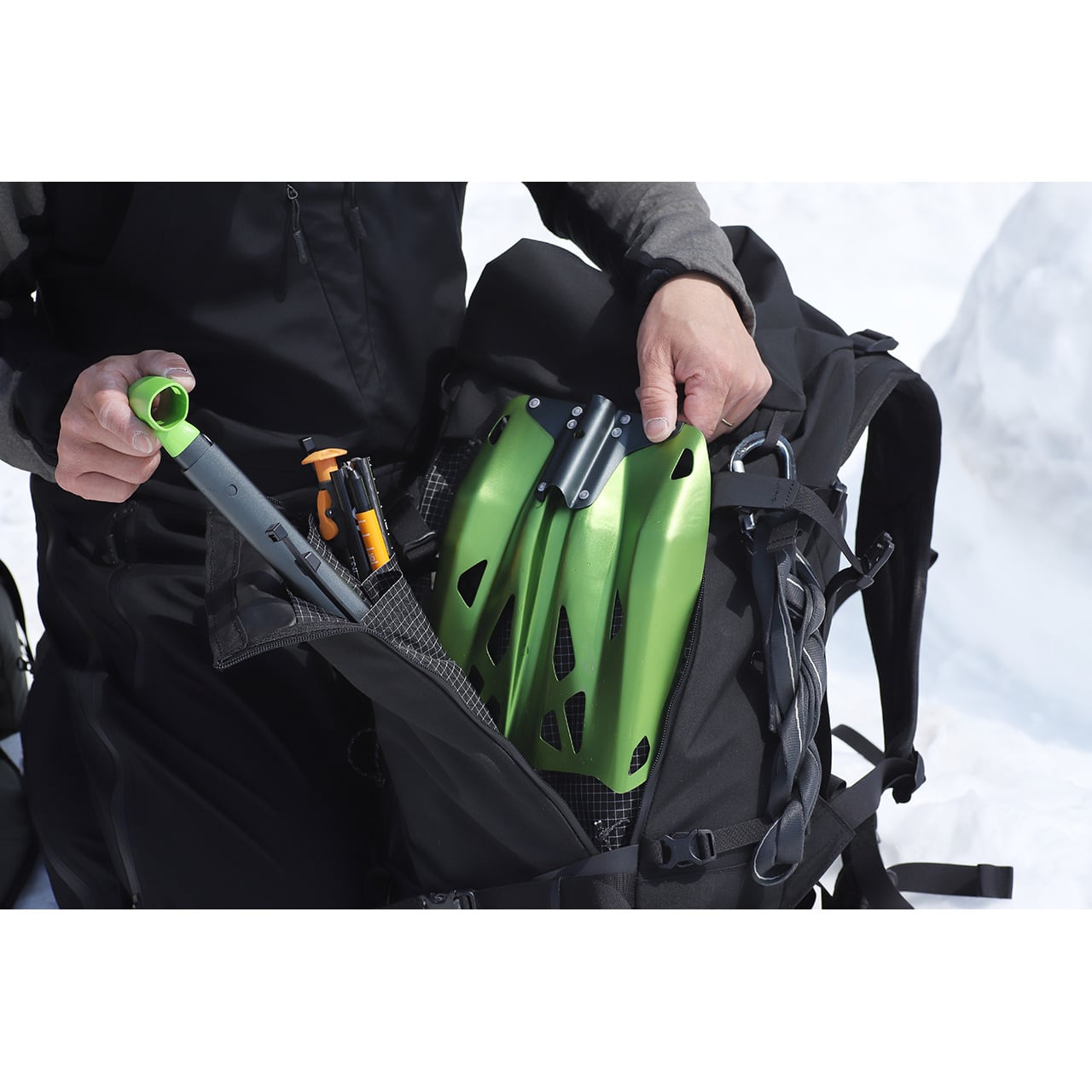 表面のアバランチギア用ポケットには、スノーショベルのブレード、シャフト、ゾンデ(プローブ)、スノーソーを整理して収納できるように仕切りを設けました。