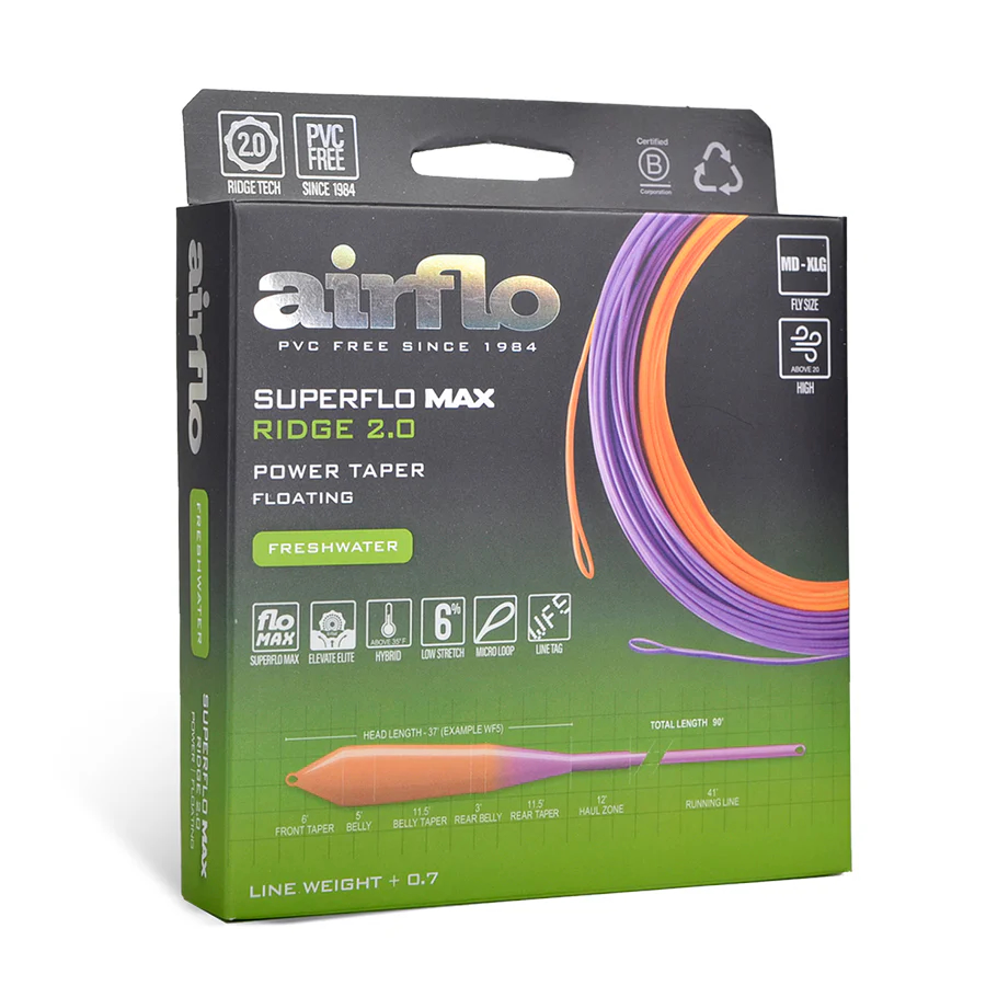 SUPERFLO MAX RIDGE 2.0 - POWER TAPER は、ビッグフライ対応のフライラインを探している方に最適な「高エネルギー・パワーテーパー」設計で、速いロッドでも重いリグを気持ちよくターンオーバーできます。