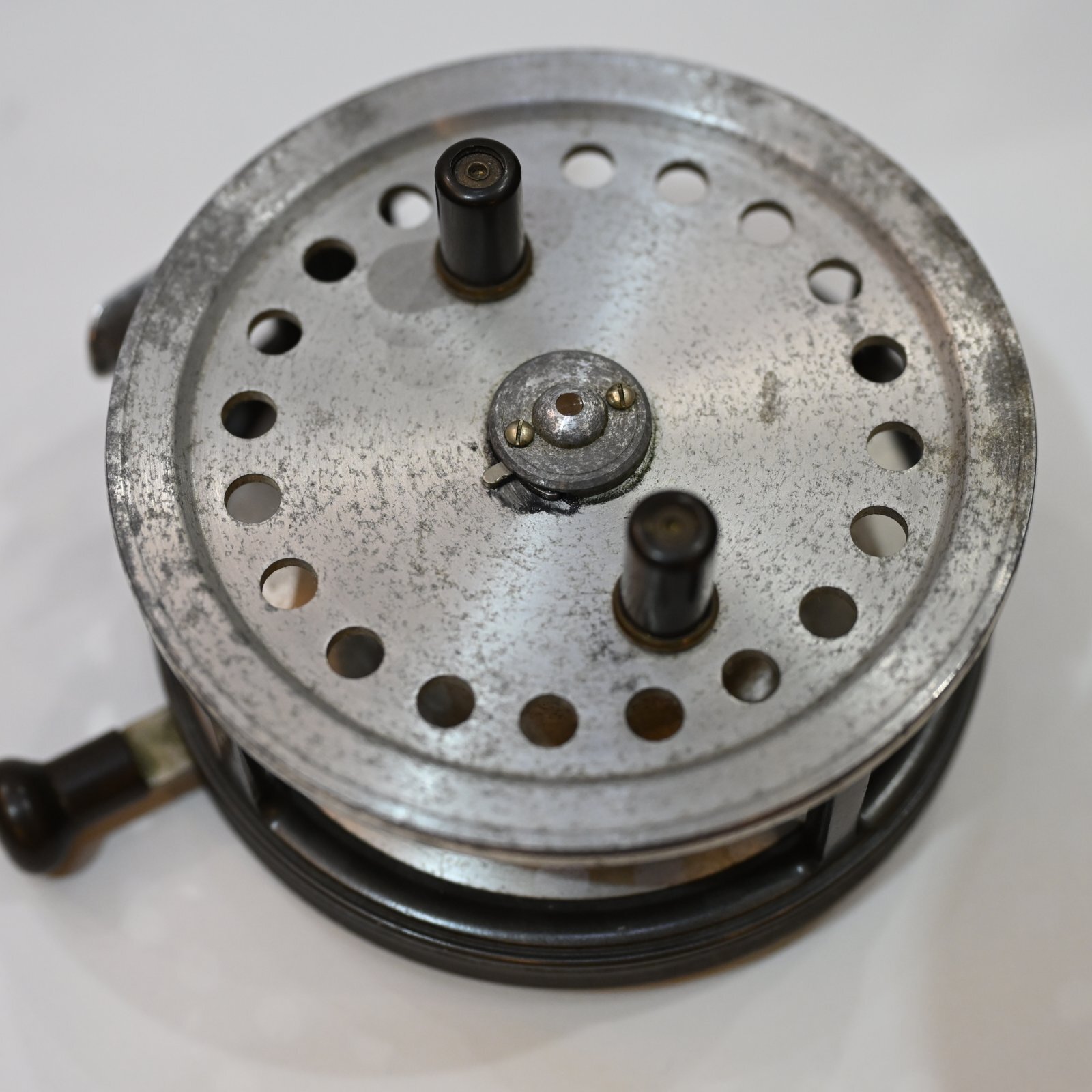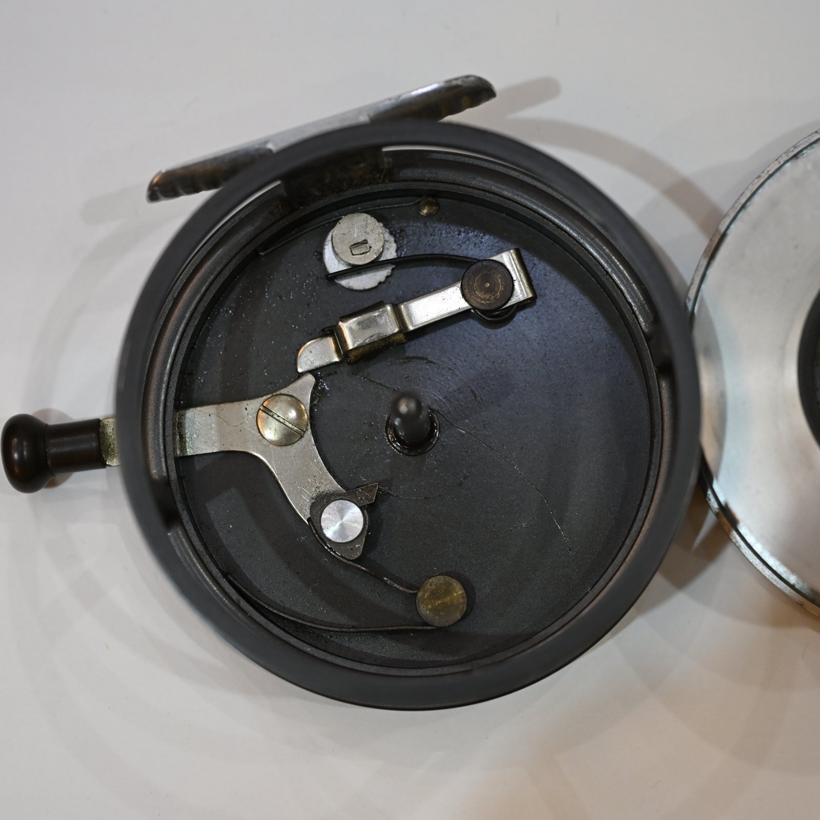 経年に伴う擦れや傷、塗装の剥がれなどは見られますが、ヴィンテージリールとしては良好なコンディションを維持しています。スプールの回転はスムーズで、チェック機構も正常に作動しており、問題なく使用可能です。